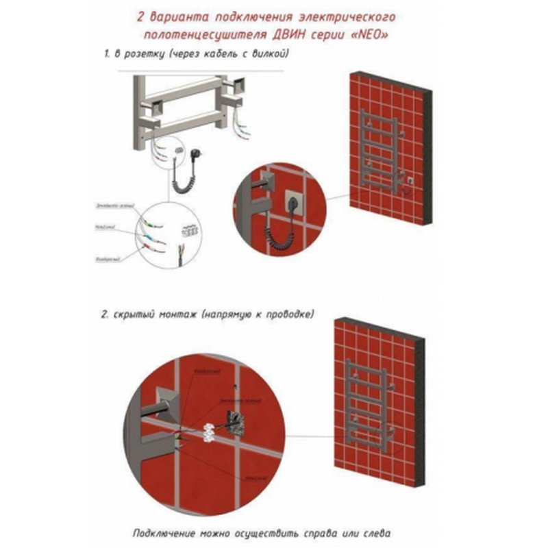 Электрический полотенцесушитель ДВИН J с димером из серии "NEO". Уникальная конструкция позволяет осуществить подключение к электросети, где бы ни находилась розетка - справа или слева!