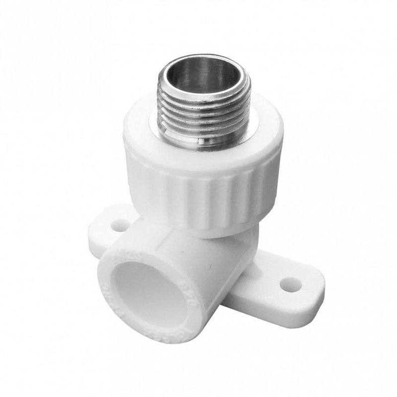 Комбинированный установочный угол из полипропилена с наружной резьбой. Имеет специальные ушки, для крепления к стене. Часто используется для подключения смесителей без использования дополнительных кранов (напрямую).