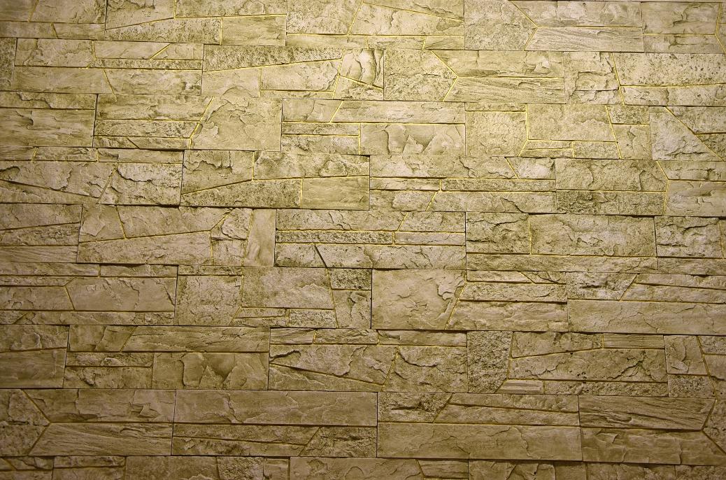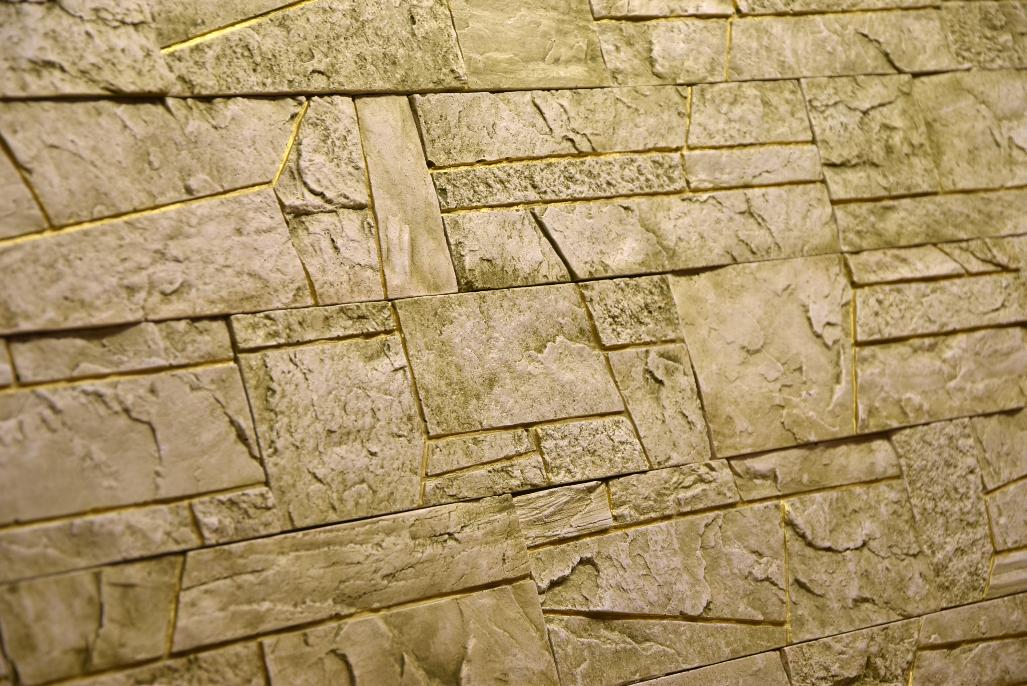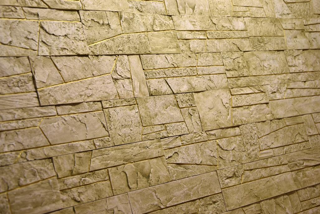 Искусственный камень «Сланец ПЕЩЕРНАЯ БРЕКЧИЯ». Он олицетворяет скопления обломков и целых костей млекопитающих, встречающиеся в пещерах. Обычно, эти составляющие сцементированы железистым, песчано-глинистым или глинистым цементом. В нашем случае, это имитация породы из гипса.