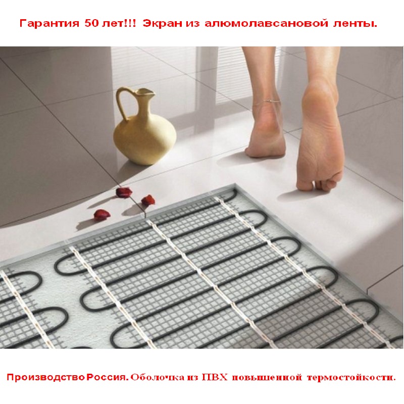 Двужильный кабельный мат на сетке Российского производства (экранированный кабель высокого качества). Изоляционный термостойкий материал. Экран из алюмолавсановой ленты. ПВХ материал пониженной пожароопасности. Не требуют обязательной установки в бетонную стяжку, возможна укладка непосредственно в плиточный клей. Экономия электрической энергии. Не увеличивает уровень пола.