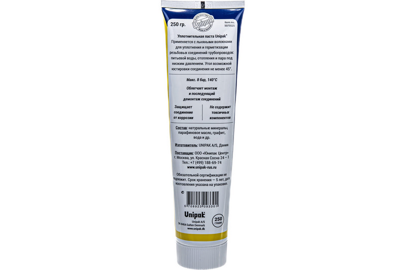 Паста UNIPAK для воды/пара обеспечивает полную водо- и паронепроницаемость мест резьбового соединения в системах отопления, водоснабжения и пара под низким давлением. Предназначена для использования совместно с волокнами льна либо специальной льняной нитью. Вес тюбика — 250 г.