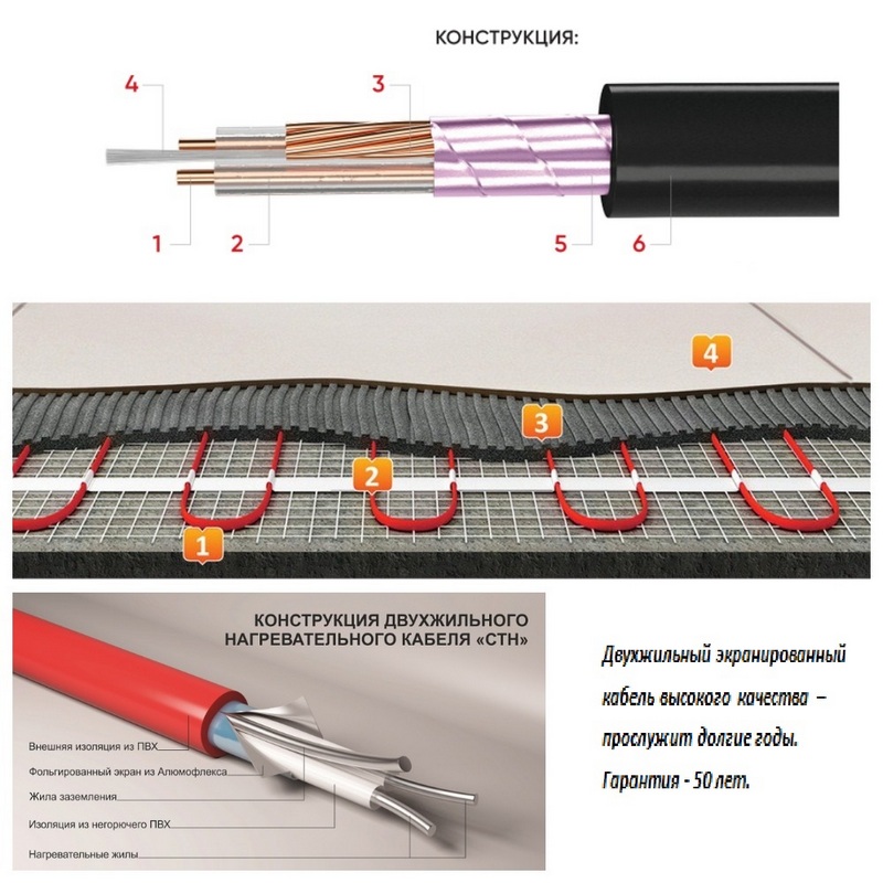 Двужильный кабельный мат на сетке Российского производства (экранированный кабель высокого качества). Изоляционный термостойкий материал. Экран из алюмолавсановой ленты. ПВХ материал пониженной пожароопасности. Не требуют обязательной установки в бетонную стяжку, возможна укладка непосредственно в плиточный клей. Экономия электрической энергии. Не увеличивает уровень пола.